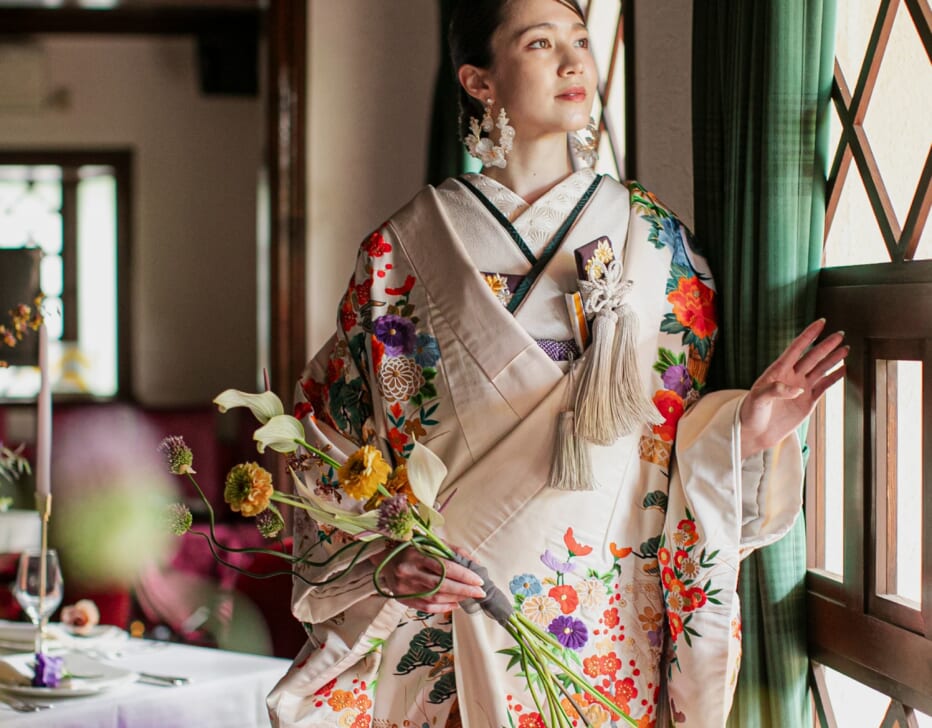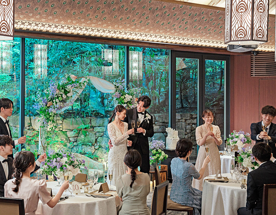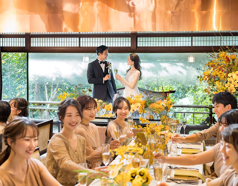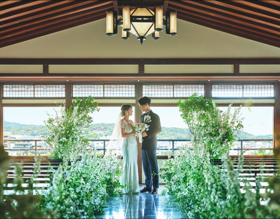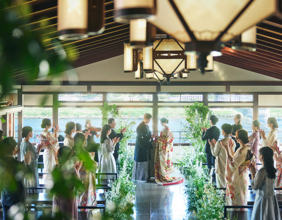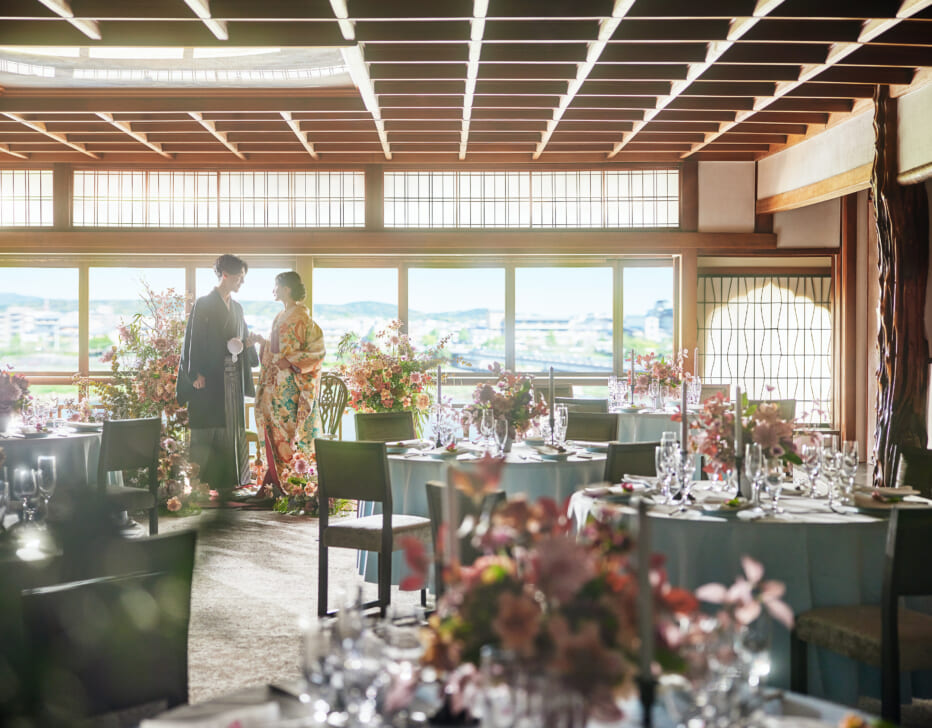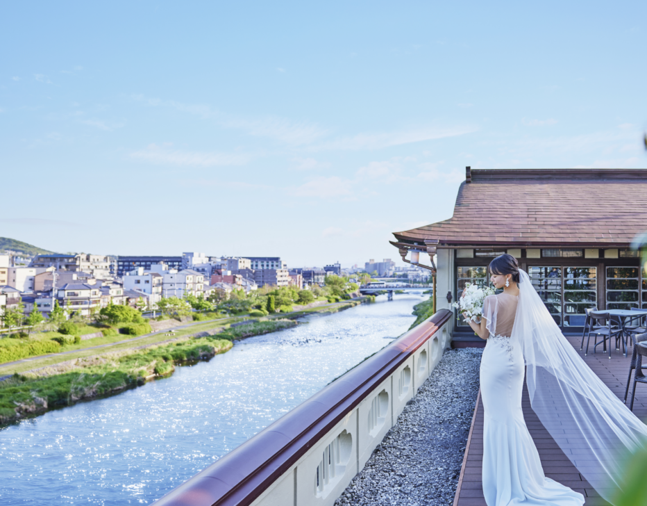 鴨川も東山もぜいたくに一望できる「鮒鶴京都鴨川リゾート」で、和と洋が織りなすレトロモダンウェディング。四季が彩る京都ならではの眺めを独占する鴨川ほとりの文化財。