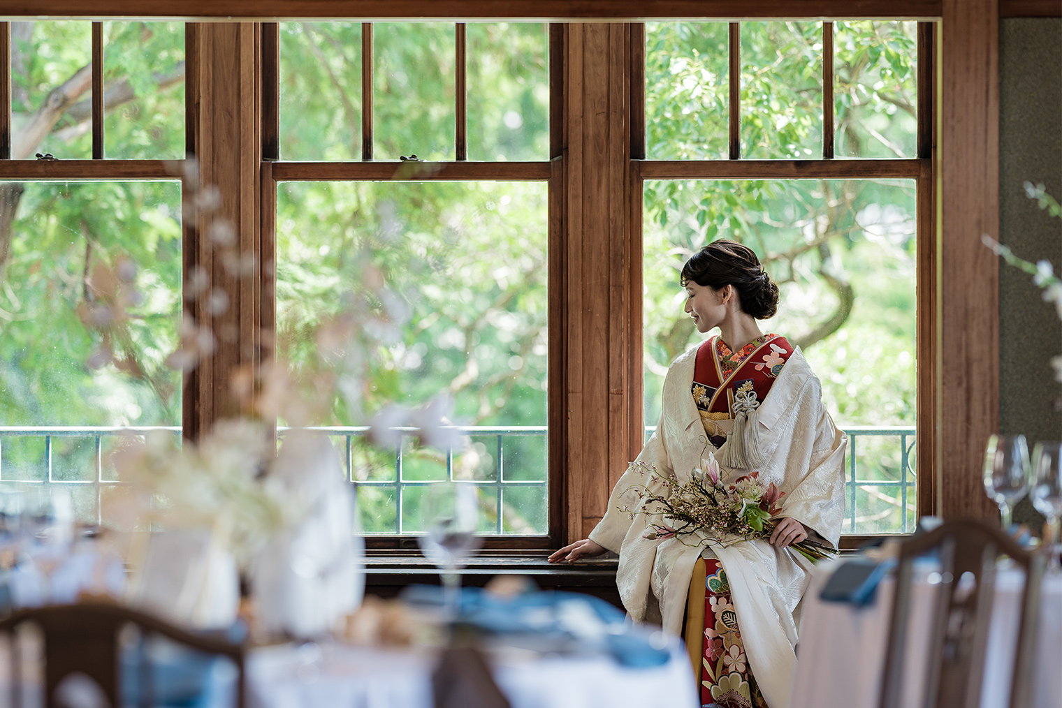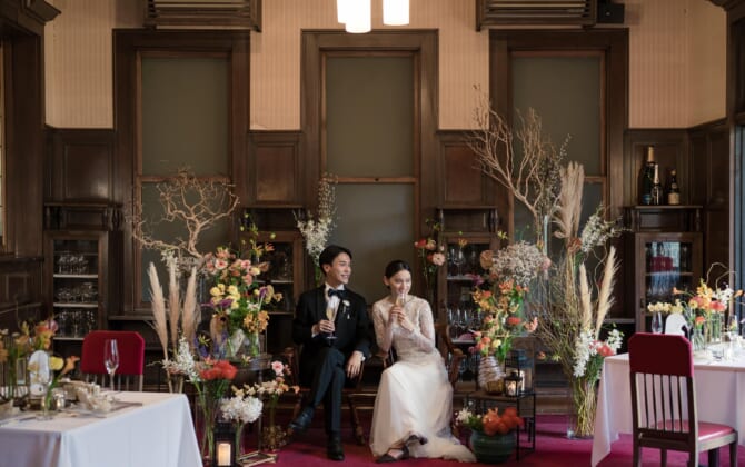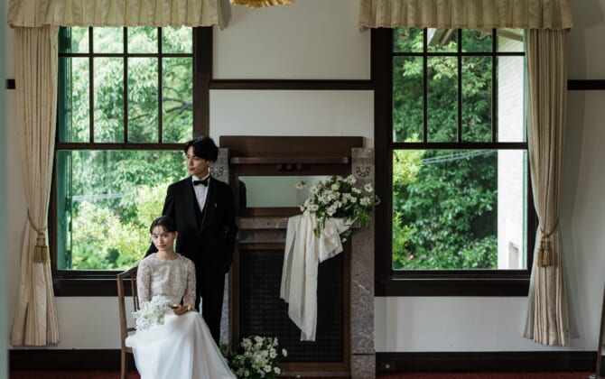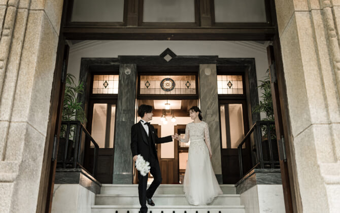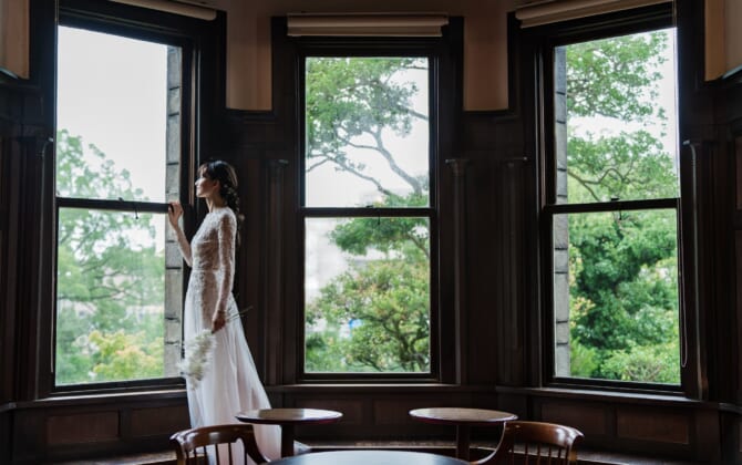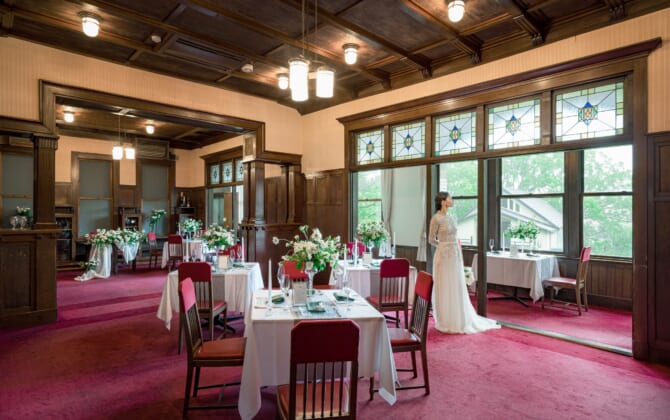四季豊かな名勝日本庭園をはじめ、赤階段やステンドグラスが煌めく洋館の本館は非日常そのもの。 ドレス和装を引き立てる、おもてなしの文化財ウエディングが叶う。